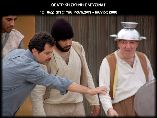 Η νεόκοπη λοιπόν θεατρική σκηνή της Ελευσίνας με την ενίσχυση και υποστήριξη του Δήμου, έκανε φέτος ένα θαυμαστό ακόμη βήμα, ανεβάζοντας για τέσσερις συνεχείς παραστάσεις στο μικρό θεατράκι του πάρκου κυκλοφοριακής αγωγής στα Αλώνια, το έργο του Ρουτζάντε «Χωριάτες» μια πολύ επιτυχημένη συρραφή που έκανε ο Γάλλος ηθοποιός Αντρέ Ζυλ γύρω στα 1950 από έργα του Ρουτζάντε (Άντζελο Μπεόλκο 1502-1592).
